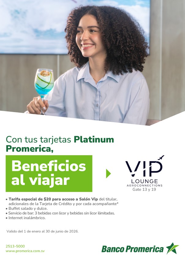 - Beneficio aplica únicamente en salón VIP Aeroconnections ubicado en Aeropuerto internacional de El Salvador frente a puerta de embarque 13 o 19 y Aeropuerto Internacional de Ilopango.