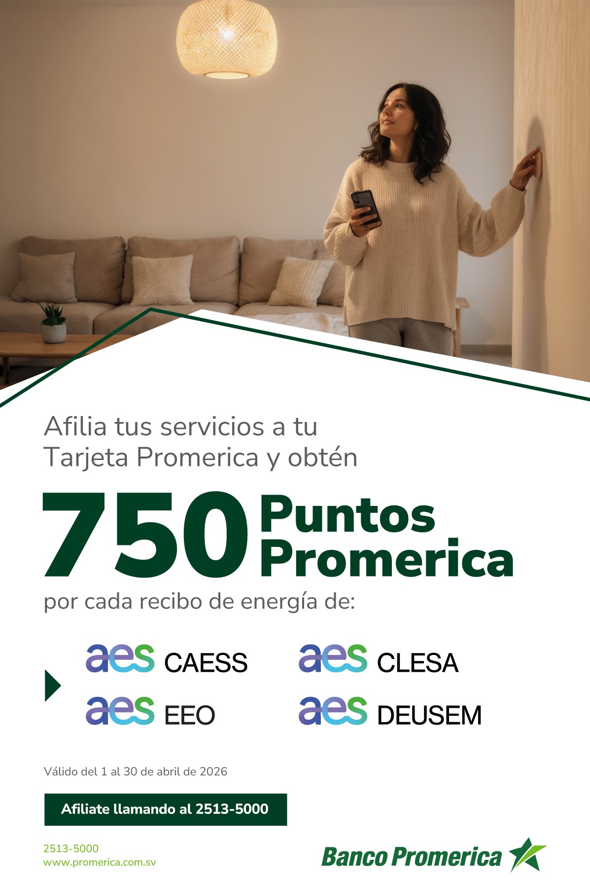 - La bonificación de 750 Puntos Promerica de bienvenida aplica por cada recibo de energía eléctrica afiliado al pago automático con Tarjetas de Crédito y Débito que acumulen Puntos Promerica.