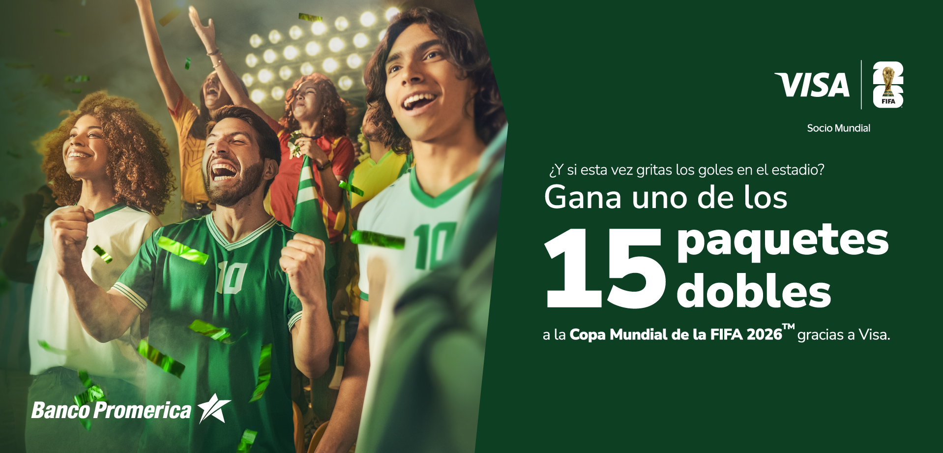 Cada compra con tus Tarjetas Visa de Banco Promerica te acerca a vivir la Copa Mundial de la FIFA 2026™. ¡Tú y un acompañante podrían vivir la experiencia en un viaje todo pagado!